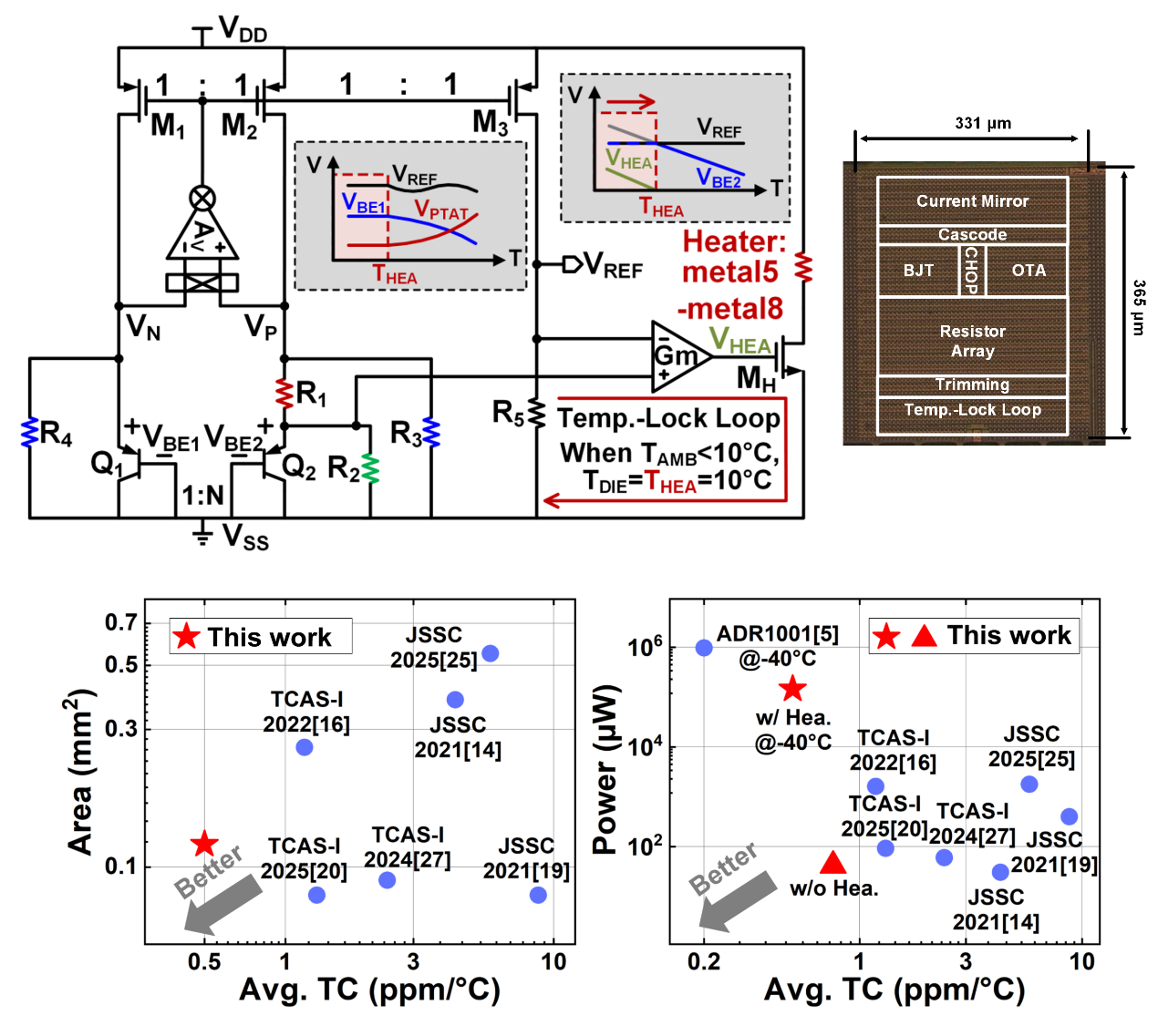 高精度电压基准源是智能电表、工业传感器等精密测量系统的核心器件,这类系统通常要求电压基准在工业级温度范围(−40℃ 至 85℃)内具有低于1ppm/℃的超低温度系数。然而,传统的带隙基准受限于双极性晶体管基极-发射极电压的固有非线性曲率,其温漂性能难以突破1ppm/℃的瓶颈。针对上述难题,我校半导体学院陈卓俊教授团队创新性提出了一种电学和热学相结合的混合补偿技术,基于65nm CMOS工艺成功设计并流片了一款采高精度电...
