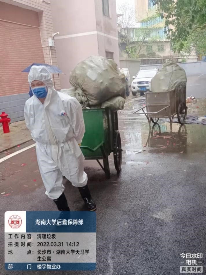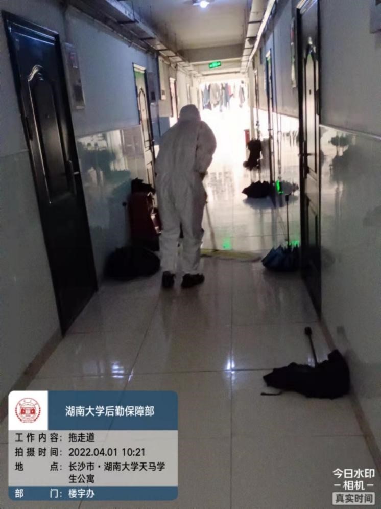 “其实最近几天我一直睡得不太好,但每天早上还是七点钟就起床了,给其他员工送早餐、通知他们做核酸,宿舍楼道消杀完毕后,就开始一层一层拖地,有些门口的垃圾也要打包好,一包一包地拎到楼下。”