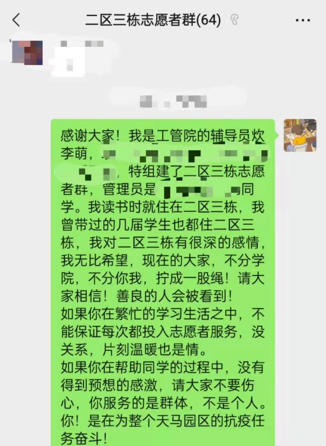 但当好一个“楼长”,不仅要做好统筹工作,还要“稳定军心”。因此,每天光是上下楼,她的微信步数就过万了,她在“扫楼”的过程中,去每个寝室送上“自我介绍”:“我是你们的楼栋辅导员炊李萌,不要慌,有事就给我打电话。”然后迅速招募学生志愿者,给他们送上一剂“定心丸”:“我无比希望,现在的大家,不分学院,不分你我,拧成一股绳!善良的人会被看到!”此话一出,许多学生主动找到她,要求加入志愿者队伍。