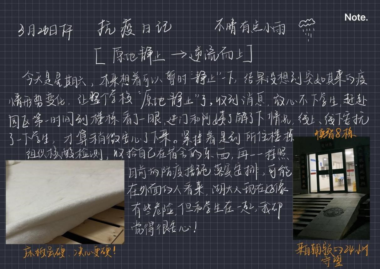 “床板虽硬,决心更硬!”进园区第一天,丛珊珊在自己的“抗疫日记”中写下了这句话,丛珊珊觉得“和学生在一起,很安心”!