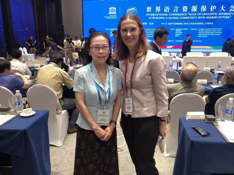 语言资源保护是国家语言的重要项目,2018年联合国主办的“首届世界语言资源保护大会”就在长沙召开,湖南大学党委宣传部(新闻办公室)地址中心是主要承办单位。联合国考察组来岳麓书院考察时,彭兰玉把用祁东话演唱的渔鼓戏表演带到现场,考察组觉得很有意思。在大会的平行论坛“语言资源保护新工具和新技术”中,彭兰玉也分享了她的研究报告。这次大会结束后,联合国教科文组织向世界颁布了《岳麓宣言》,这是联合国教科文组织首个以“保护语言多样性”为主题的重要永久性文件。