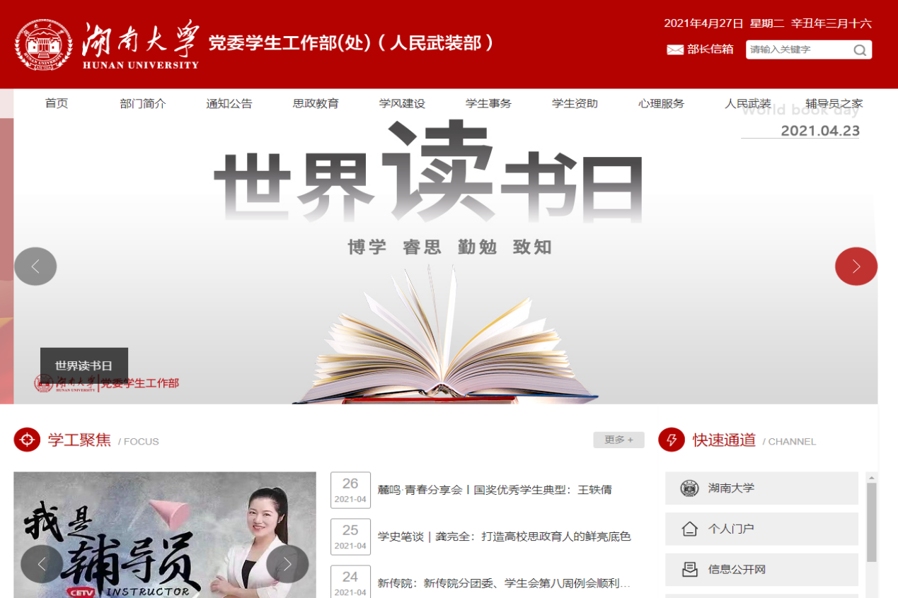 推动学生工作信息化建设,建立学生事务管理工作信息化运行机制,上线学工系统2.0版本,实现“让数据多跑路,让师生少跑腿”。开展“心理危机的识别与应对”专题培训,提升教师队伍对心理危机的识别与应对的能力,提高心理危机干预措施的及时性和有效性,首期外国语学院和新闻学院的全体教职工、部分心理委员参与培训。开展世界读书日活动,设计“明信片寄书评”“读书故事”“抽题作答”“转盘说党史”“图书漂流”等集知识性、趣味性、参与性于一体的活动,激发同学们的阅读学习兴趣、扩展阅读空间,营造浓厚阅读氛围。联合后保部举行“文明风,清洁行”校园清洁活动,定期组织学生志愿者开展校内公益志愿活动,弘扬劳动精神及公益志愿服务精神,推动公益文化建设,培养师生的环境保护意识,创造美好洁净的校园环境。