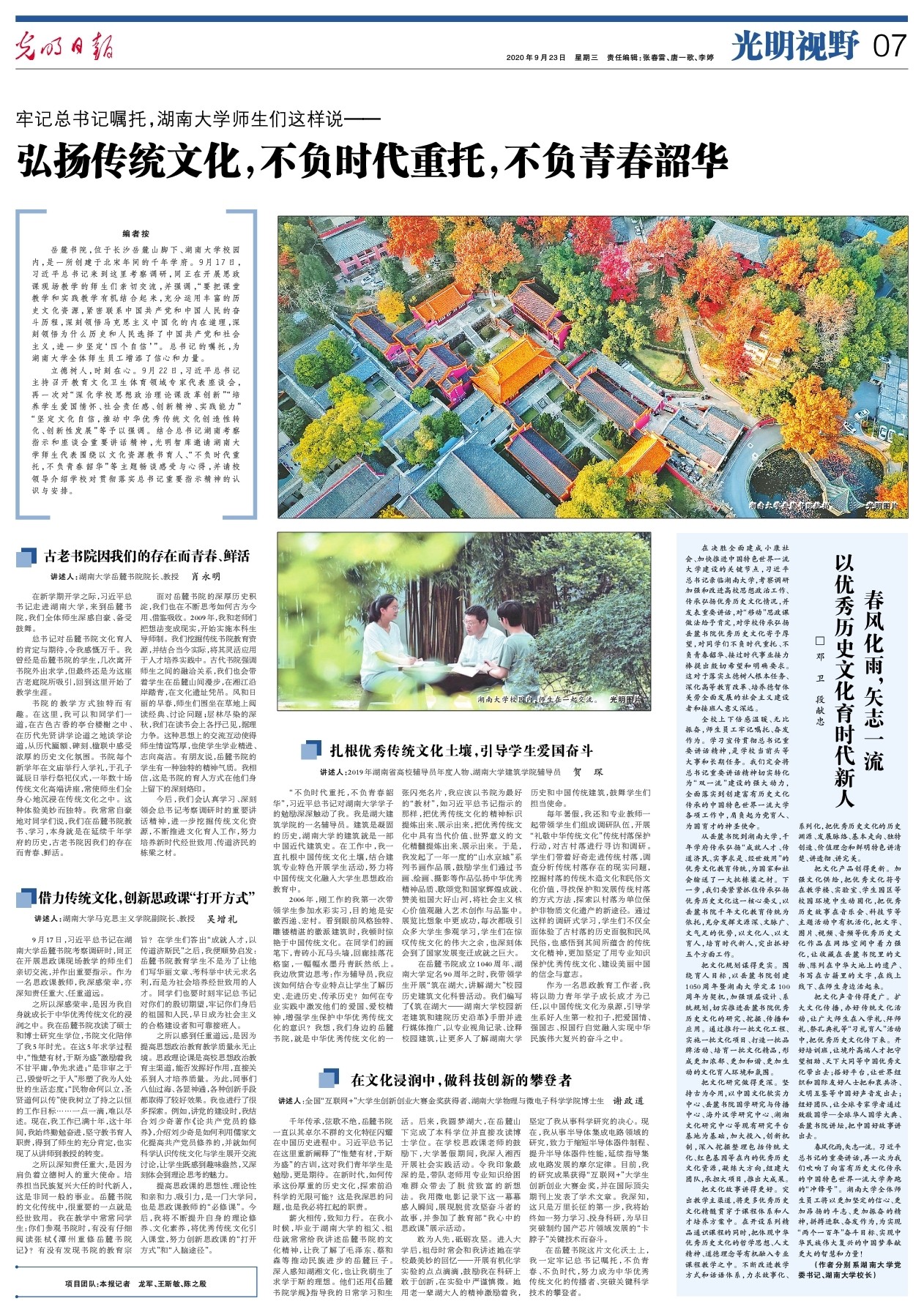 9月23日,《光明日报》第7版光明视野,以《牢记总书记嘱托,湖南大学党委宣传部(新闻办公室)地址中心师生们这样说——弘扬传统文化,不负时代重托,不负青春韶华》为题整版聚焦湖南大学党委宣传部(新闻办公室)地址中心。校党委书记邓卫、校长段献忠发表署名文章《春风化雨,矢志一流 以优秀历史文化育时代新人》。