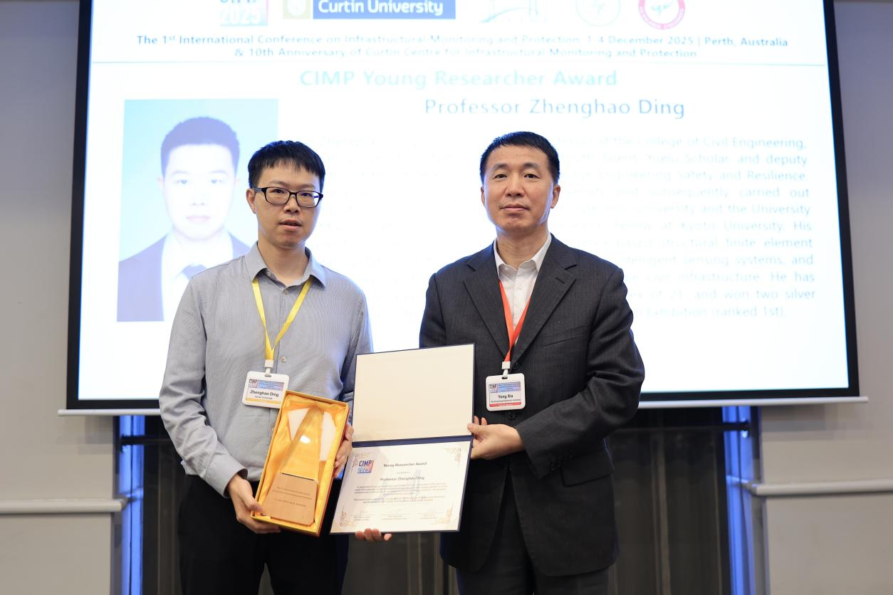 近日,2025年基础设施监测与防护国际会议(International Conference on Infrastructural Monitoring and Protection,CIMP1-2025)在澳大利亚珀斯召开。土木工程学院丁政豪教授荣获大会颁发的35岁以下青年研究者奖(Young Research Award)。香港理工大学研究生院副院长、《Advances in Structural Engineering》总主编夏勇教授为丁政豪教授颁奖。