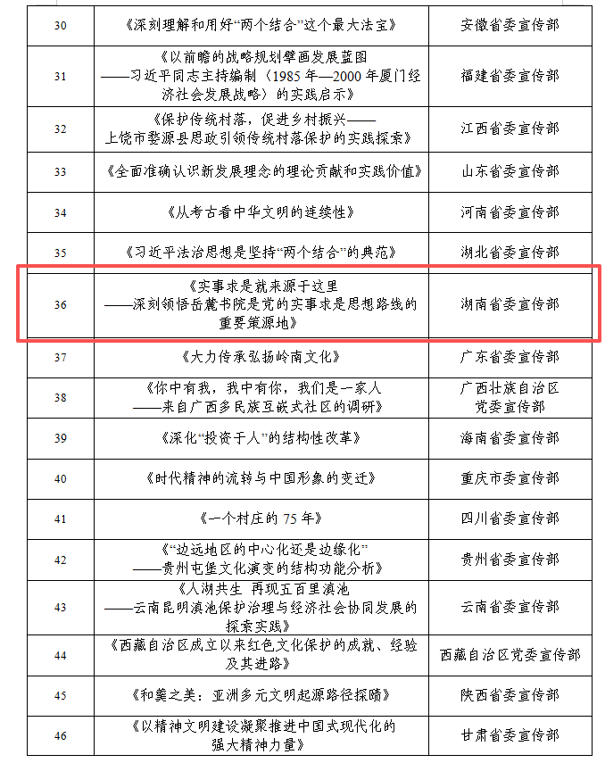 近日,经《湖南日报》自主申报、湖南省委宣传部审核推荐、中共中央宣传部集中评选,我校理论文章《实事求是就来源于这里——深刻领悟岳麓书院是党的实事求是思想路线的重要策源地》入选2025年度全国优秀理论宣传作品扶持计划,也是湖南省2025年度唯一入选的理论文章。