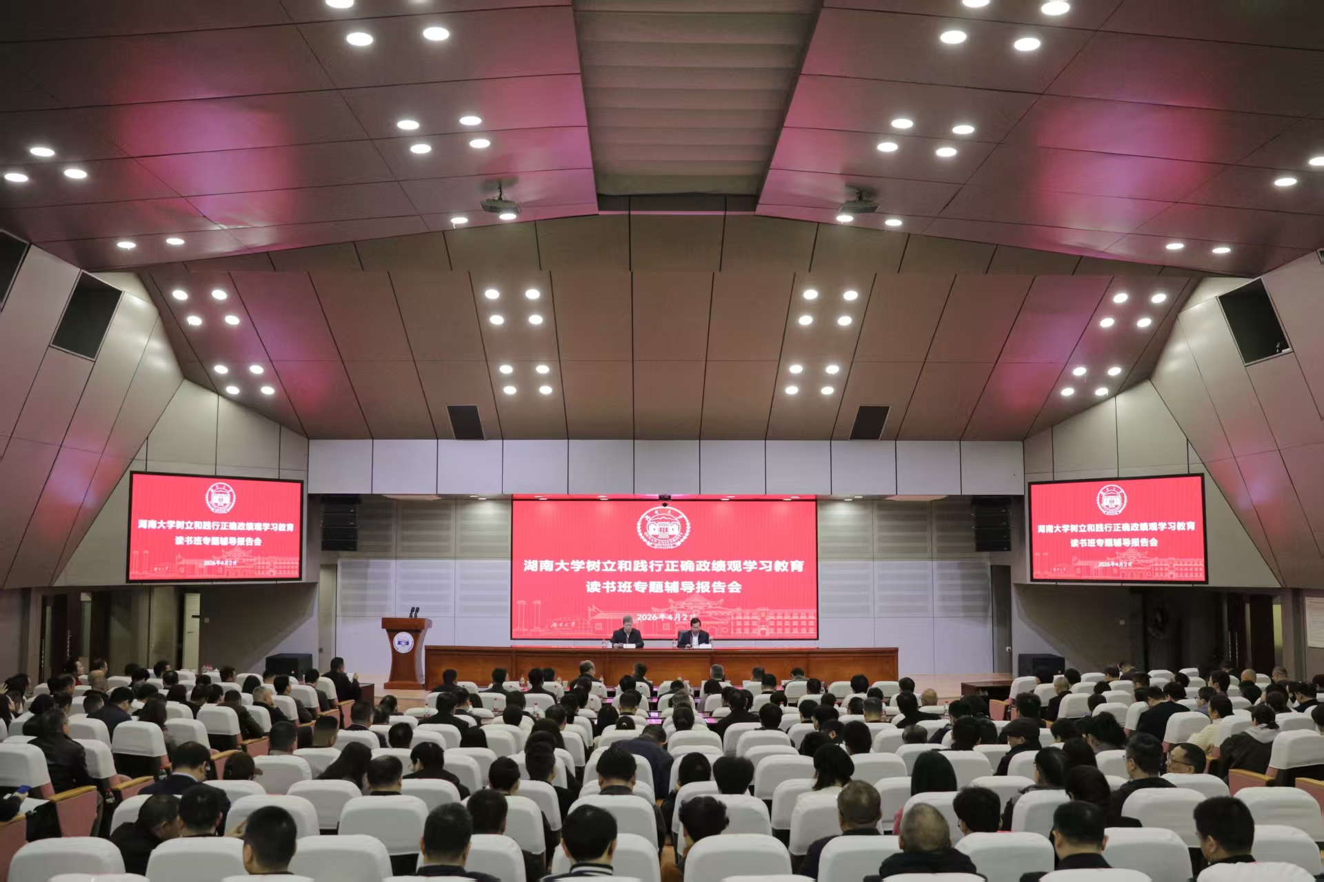3月30日至4月2日,湖南大学党委宣传部(新闻办公室)地址中心领导干部树立和践行正确政绩观学习教育读书班举行。校党委书记邓卫、校长段献忠等校领导,党委常委参加。教育部直属高校党建工作联络员、中南大学原党委常务副书记陶立坚出席开班式。湖南省社科联党组书记、副主席(主持日常工作)胡代松作专题辅导报告。邓卫主持相关活动。