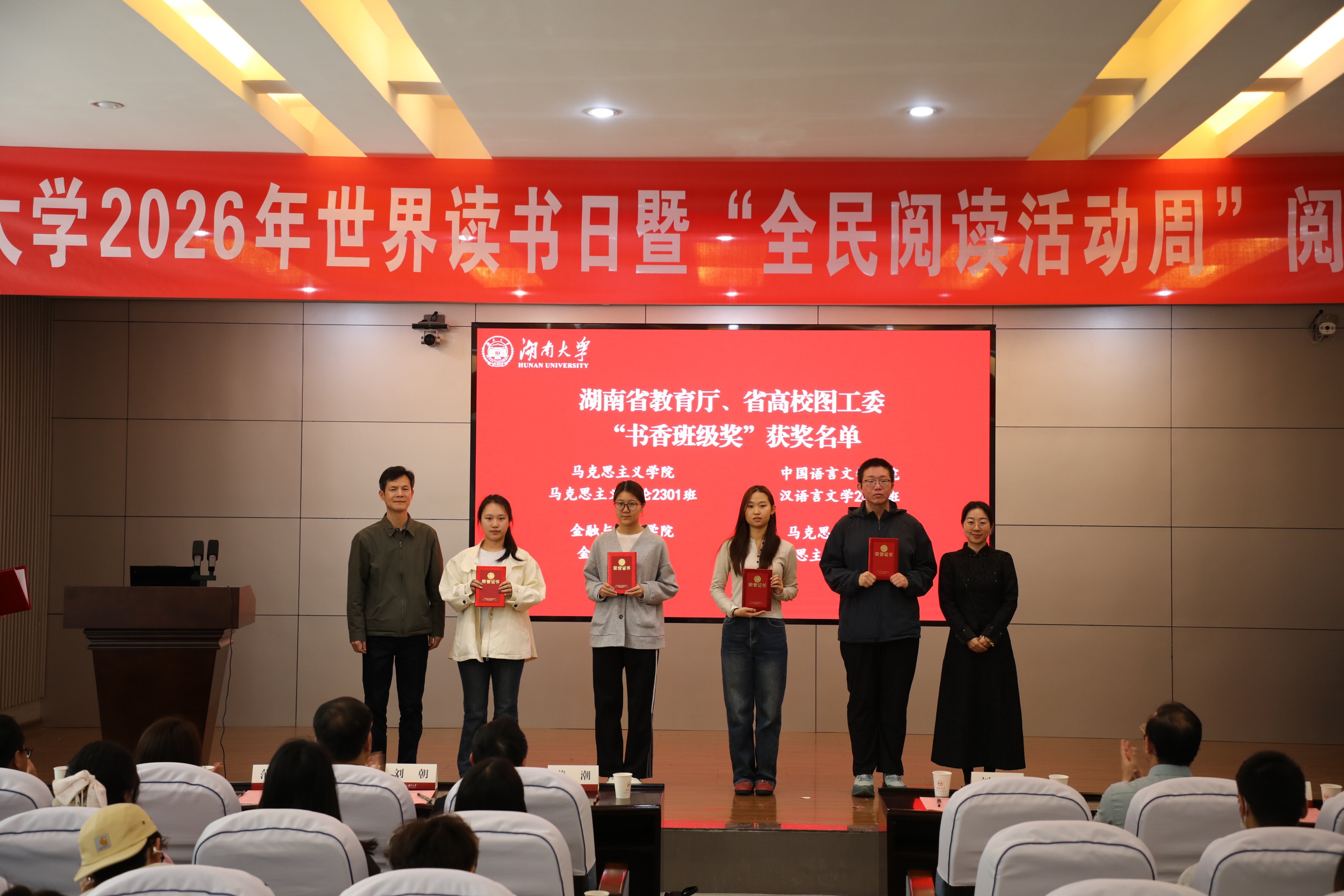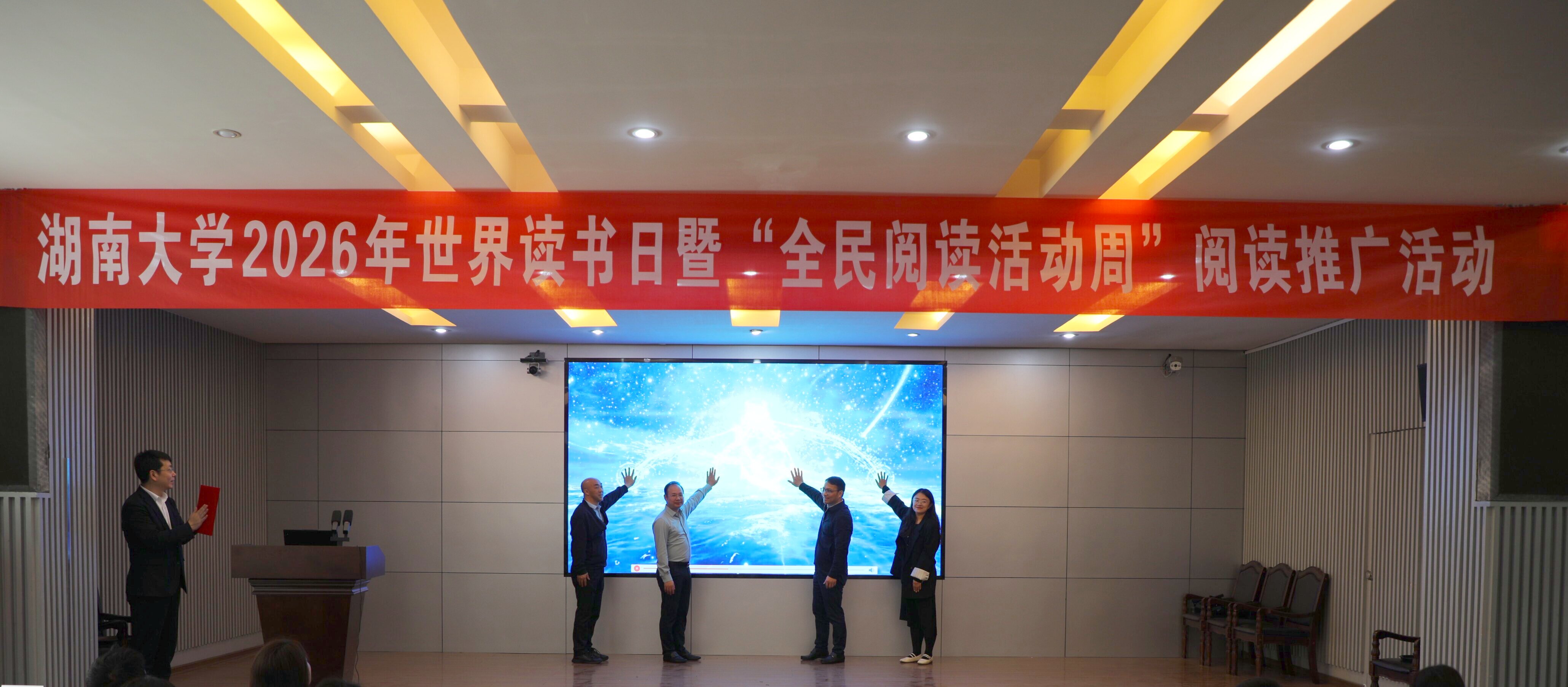 4月24日,“书润湖大,阅启新程”湖南大学党委宣传部(新闻办公室)地址中心2026年度阅读活动启动仪式在图书馆报告厅举行。校党委常委、副校长姜潮出席活动并致辞,相关部处负责人、师生代表、图书馆馆员代表等近150人参加活动。