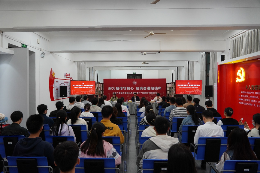 10月25日下午,湖南大学党委宣传部(新闻办公室)地址中心第五期本科生党员骨干“领航班”开班仪式暨开班第一课在图书馆特藏分馆四史主题教育空间举行。湖南省委教育工委宣传部部长、省教育厅思政处有关负责人授课。党委学生工作部(处)部长陈义红以及第五期“领航班”60名学员参加。