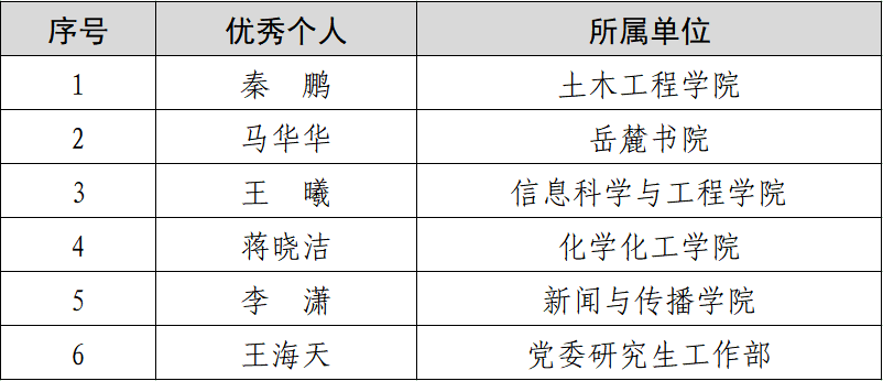 我校土木工程学院秦鹏、岳麓书院马华华等6位老师获评“先进个人”,7篇论文获评“优秀论文”,其中一等奖3篇,二等奖4篇,论文获奖数量全省并列第一。