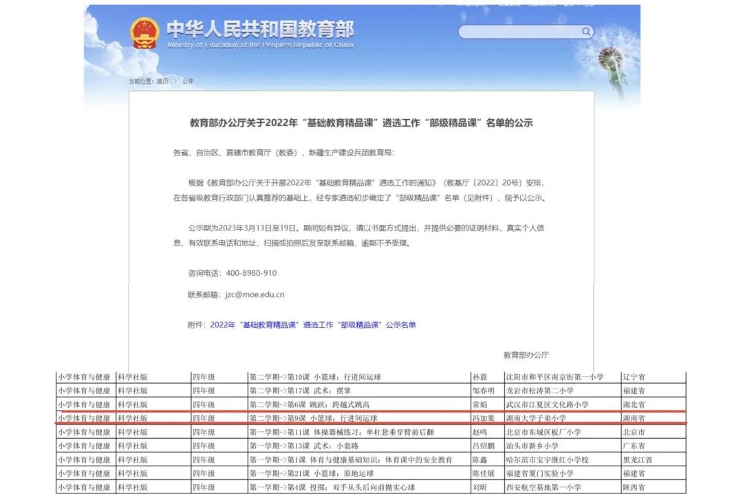 近日,教育部办公厅公布了关于2022年“基础教育精品课”遴选工作“部级精品课”的名单,子弟小学冯加果老师的体育与健康课例《小篮球——行进间运球》入选教育部2022年“部级精品课”。