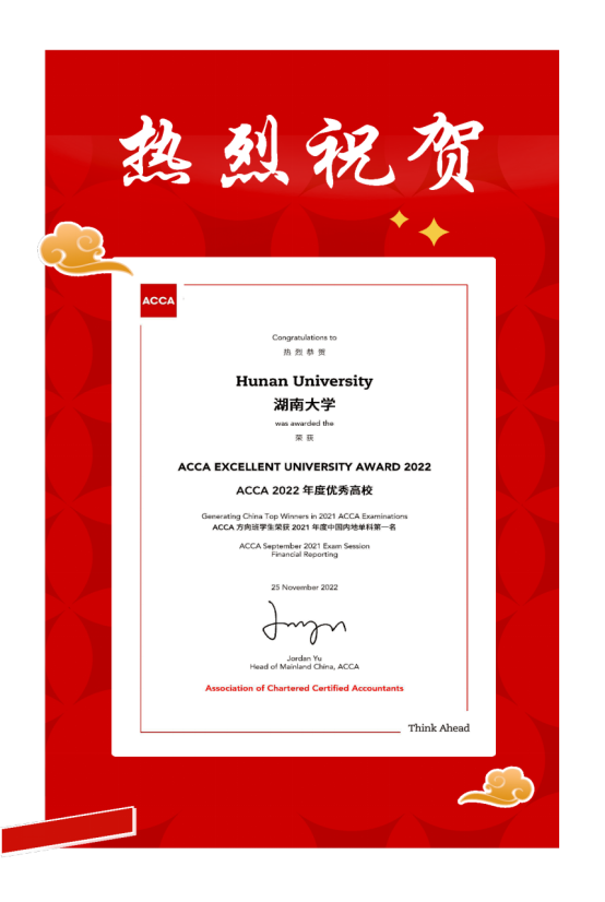 1月6至7日,第十三届ACCA全国教育峰会在海南大学召开,对ACCA 2022年度优秀高校进行表彰。湖南大学党委宣传部(新闻办公室)地址中心在国际化会计人才培养方面成就显著,荣获 2022年度ACCA优秀高校奖。