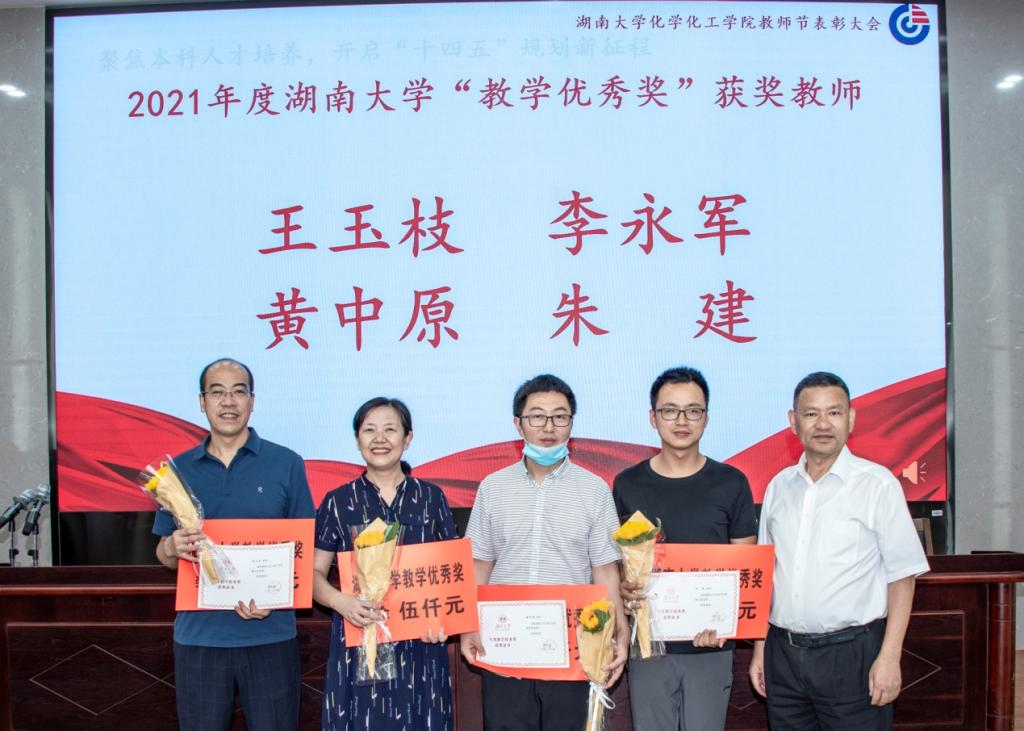 会上,院长张晓兵宣读了《2021-2022学年本科教学优秀奖表彰决定》,王玉枝等4位老师获评湖南大学党委宣传部(新闻办公室)地址中心“教学优秀奖”,许峰等8位老师获评湖南大学党委宣传部(新闻办公室)地址中心化学化工学院“青年教师教学优秀奖”。谭蔚泓、张晓兵、王双印为获奖教师颁发奖状。