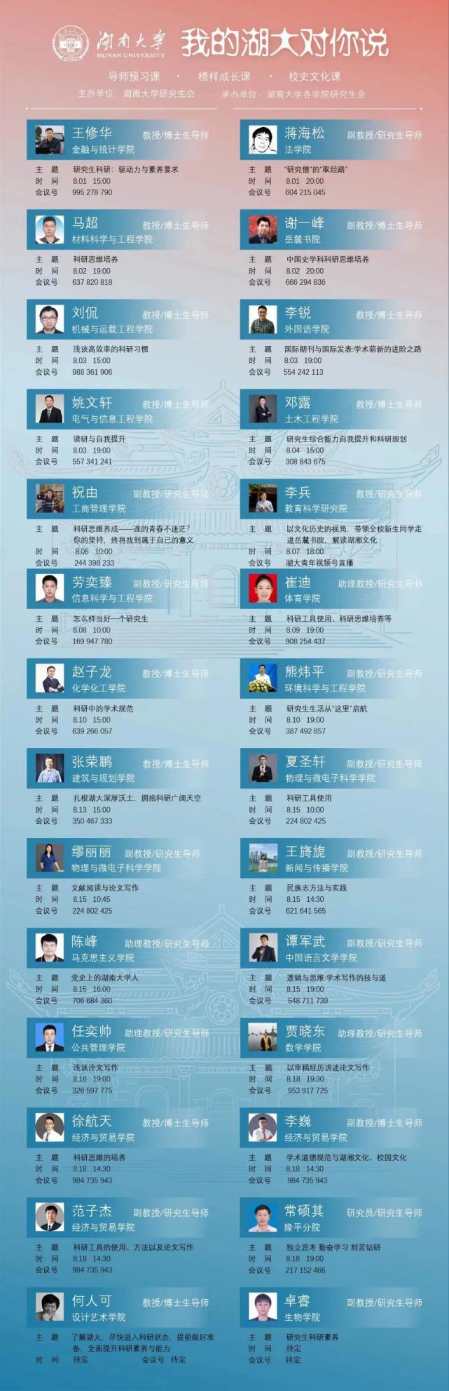 8月1日至22日,校研究生会联合各学院研究生会举办的“我的湖大对你说”系列活动,反响热烈。25场讲座,29位学术大牛、青年导师、优秀学长参与本次活动。