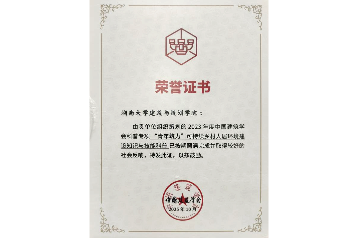 近日,2024-2025年度中国建筑学会科普教育基地工作交流会在江西景德镇举行。会议全面总结了中国建筑学会近两年科普工作成果与未来发展计划。会上,由建筑与规划学院组织策划的“青年筑力”可持续乡村人居环境建设知识与技能科普项目受到表彰,这是中国建筑学会对学院在建筑科普领域工作成绩的高度肯定。