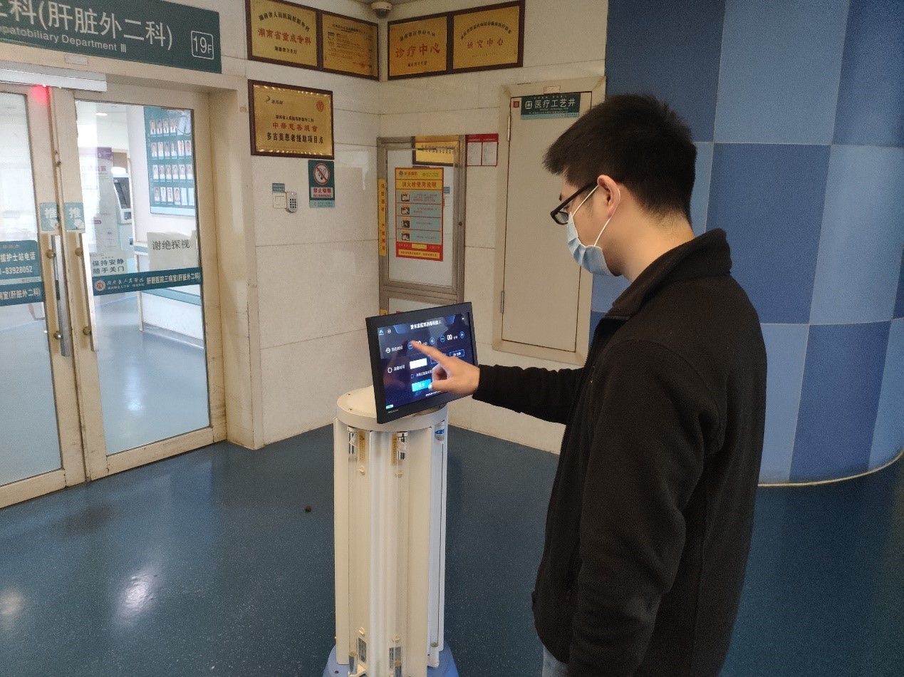 2020年初,新冠疫情突发,我一直思考着如何运用自己的专业知识为社会做些什么。后经过导师的指导,我带领团队迅速投入“防疫”机器人的研发,紧急研制出系列复杂环境测温-消毒-巡检抗疫机器人,在湖南省人民医院、中南大学湘雅三医院等正式报到“上岗”,降低了临床工作人员交叉感染的风险,提高了疫情防控工作效率,大大减轻医护人员的工作负担。