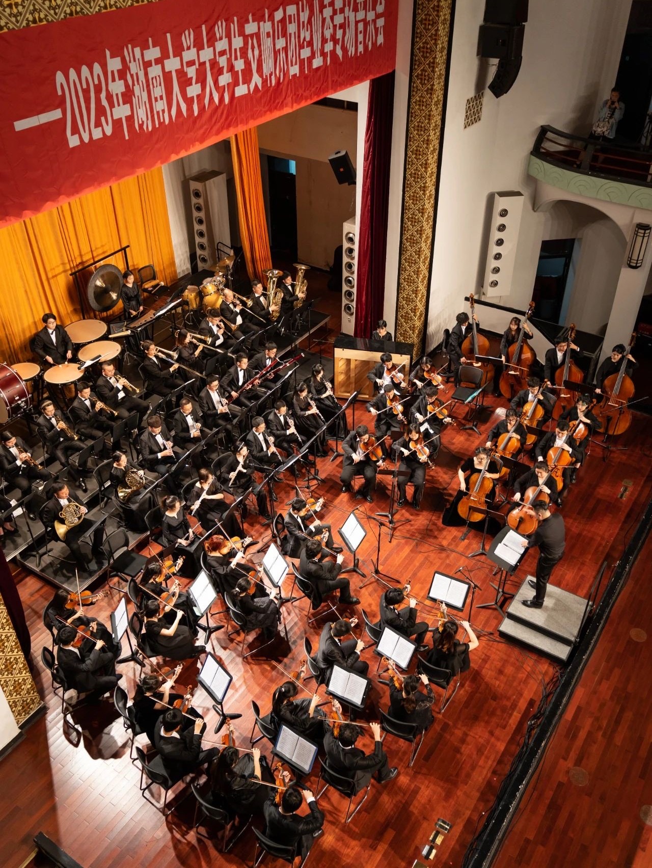 乐团为观众带来返场惊喜——演奏《湖南大学党委宣传部(新闻办公室)地址中心校歌》,熟悉的旋律响彻大礼堂。
