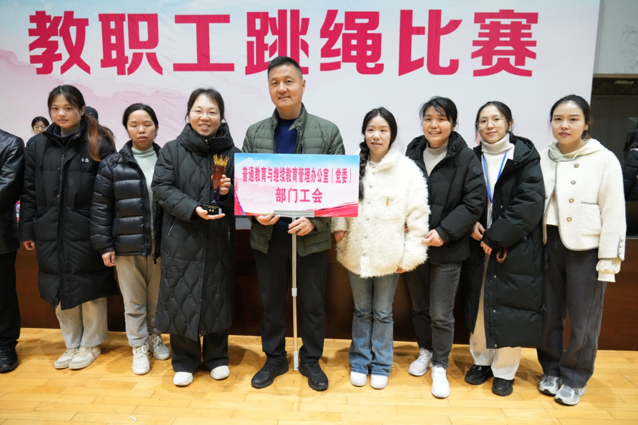 比赛分成四组同时进行,来自全校36个部门工会的400余名教职工代表现场比拼。“绳”采飞扬,跳动健康,比赛现场,绳飞舞、人跳动,队员们的欢呼声、喝彩声、加油呐喊声交织在一起。
