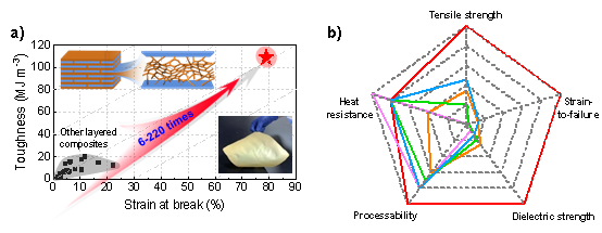 图1云母基纳米纸的性能。a)云母基纳米纸和已报道仿贝壳薄膜材料的断裂应变和韧性比较,红色五角星对应云母基纳米纸,灰色区域中黑色正方形对应已报道的各种仿贝壳层状薄膜材料。b)云母基纳米纸和国外商业化云母基微米纸的综合性能比较,红色线为云母基纳米纸,粉色线为纯云母纸,土黄色线为叠压云母带,绿色线为云母/芳纶复合纸,蓝色线为纯芳纶纸。