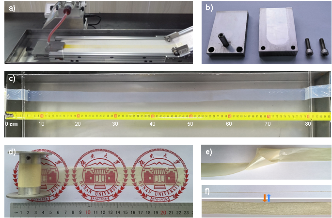图3将溶胶-凝胶-薄膜转换技术进一步扩展为连续化制备云母基纳米带。a)设计加工的装置,b)口模,c)水凝胶,d)云母基纳米带,e)打结的云母基纳米带,f)云母基纳米带在手动反复扭搓后不会破损。