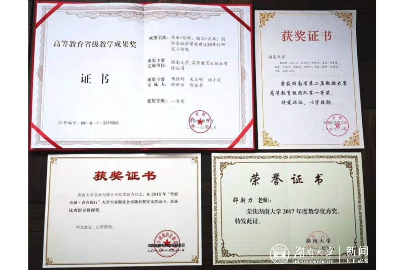 谈及智慧教育,邵新力一言一句中透露出深切的使命感和责任感。她认为,智慧教学是以培养学生的智慧为最终目标的教学,它充分利用互联网优势,打破时间与空间的限制,让学生从丰富的教育资源中获取自己感兴趣的学习内容,进行随时随地、不受限制地泛在移动式学习;让教师在课堂教学中第一时间掌握学情数据,实现学生学习的动态跟踪,帮助教师因材施教、因时施教,满足学生个性化学习,促进学生自由而全面的发展。但是,教师应该如何智慧教、又如何促进学生智慧学,需要教师课前精心的准备、课中悉心的解惑和课后用心的反馈。邵新力以国际结算、国际金融学两门课程为例,面对不同的课程环境,因人而变、因势而变,细致思考教学方案、设计教学活动,并根据具体教学情况适时调整;借助智慧教学工具,探索有效量化的形成性评价,调动学生课堂参与的热情和效率,努力帮忙学生在课程学习中实现“学到、悟到、做得到”。她积极开展国际金融学、国际结算等课程改革,努力提升课程品质,教学改革不断取得优良成效。作为第一或主要完成人,2012年主编出版国家级双语示范课程教材《国际结算》,2016年主编出版全国“十二五”规划教材《国际金融》(第四版),2016年《国际金融学》在中国大学慕课上线,开课7次累计选课人数近10万,2017年《国际金融》获湖南省微课大赛团体一等奖,2019年《传承+创新、精品+共享:国际金融学课程建设30年的研究与实践》获湖南省高等教育教学成果一等奖。