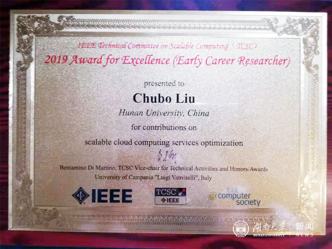 “优秀青年学者奖”于2013年由IEEE TCSC设立,专门表彰获得博士学位五年内在学术上做出突出贡献并具有长远发展潜力的青年学者,每年从全球遴选出3-6名在职业生涯早期做出了突出贡献的计算机领域青年科学家。这是湖大学者第二次获此殊荣,2018年信科院谢国琪副教授获该奖。