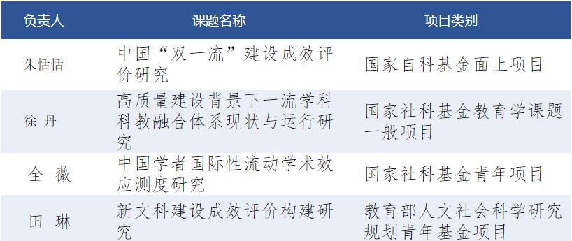 近日,2022年度国家社科基金项目评审结果和国家自然科学基金项目评审结果揭晓,朱恬恬副教授主持的“中国‘双一流'建设成效评价研究”获面上项目立项,教育科学研究院助理教授全薇主持的“中国学者国际性流动学术效应测度研究”获青年项目立项。徐丹副教授主持的“高质量建设背景下一流学科科教融合体系现状与运行研究”获国家社科基金教育学课题立项,田琳助理教授主持的“新文科建设成效评价构建研究”获教育部人文社会科学研...