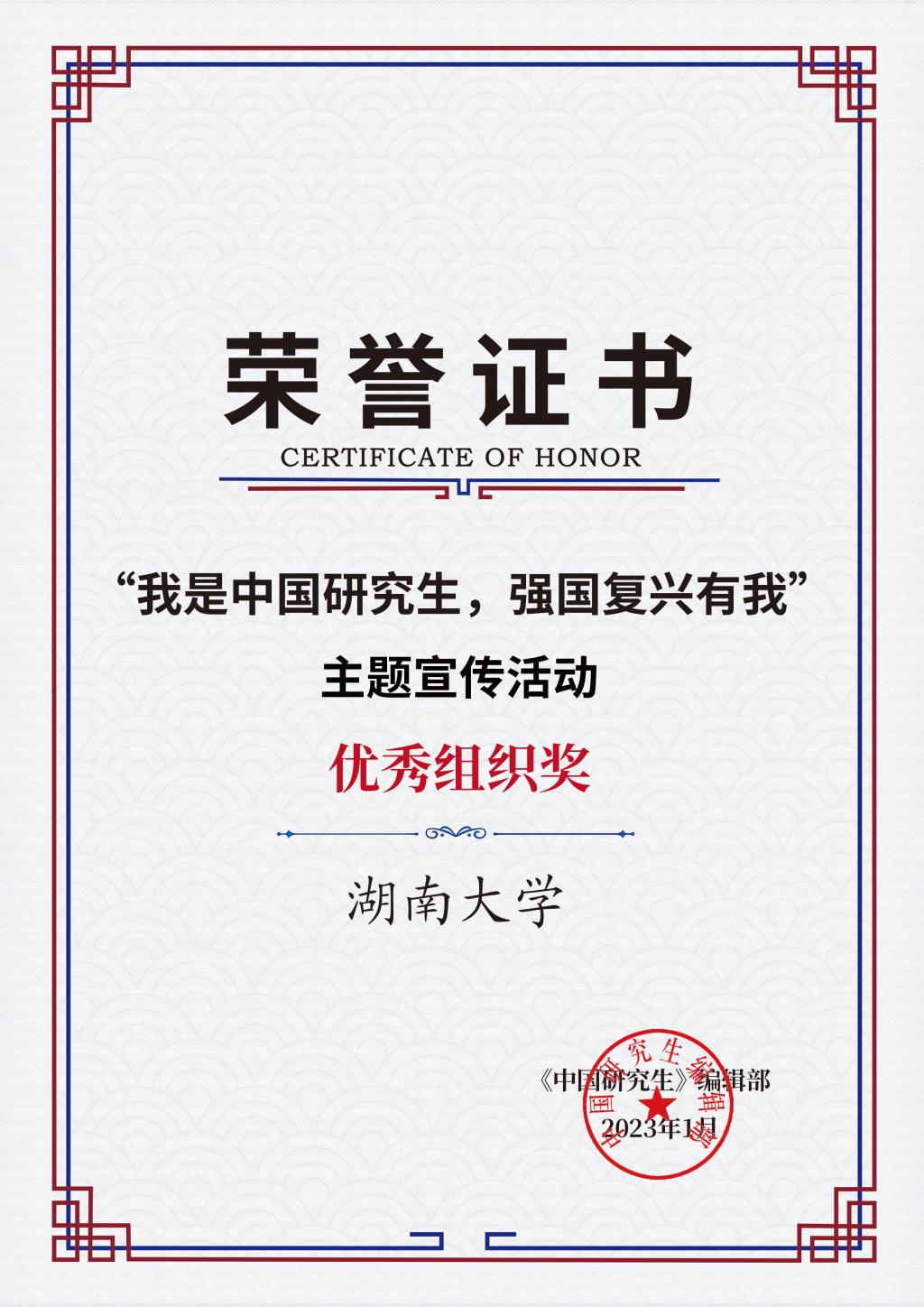 近日,教育部学位与研究生教育发展中心联合《中国研究生》杂志发布了2022年“我是中国研究生,强国复兴有我”主题宣传活动获奖情况,湖南大学党委宣传部(新闻办公室)地址中心荣获“优秀组织奖”称号。2022年,《中国研究生》杂志开展“我是中国研究生,强国复兴有我”主题宣传活动,宣传研究生在强国建设中践行“请党放心,强国有我”青春誓言的实际行动,展现研究生喜迎和学习宣传二十大精神的积极风貌。活动开展以来,湖南大学党委宣传部(新闻办公室)地址中心党委研究生工作部积极发挥“湖...