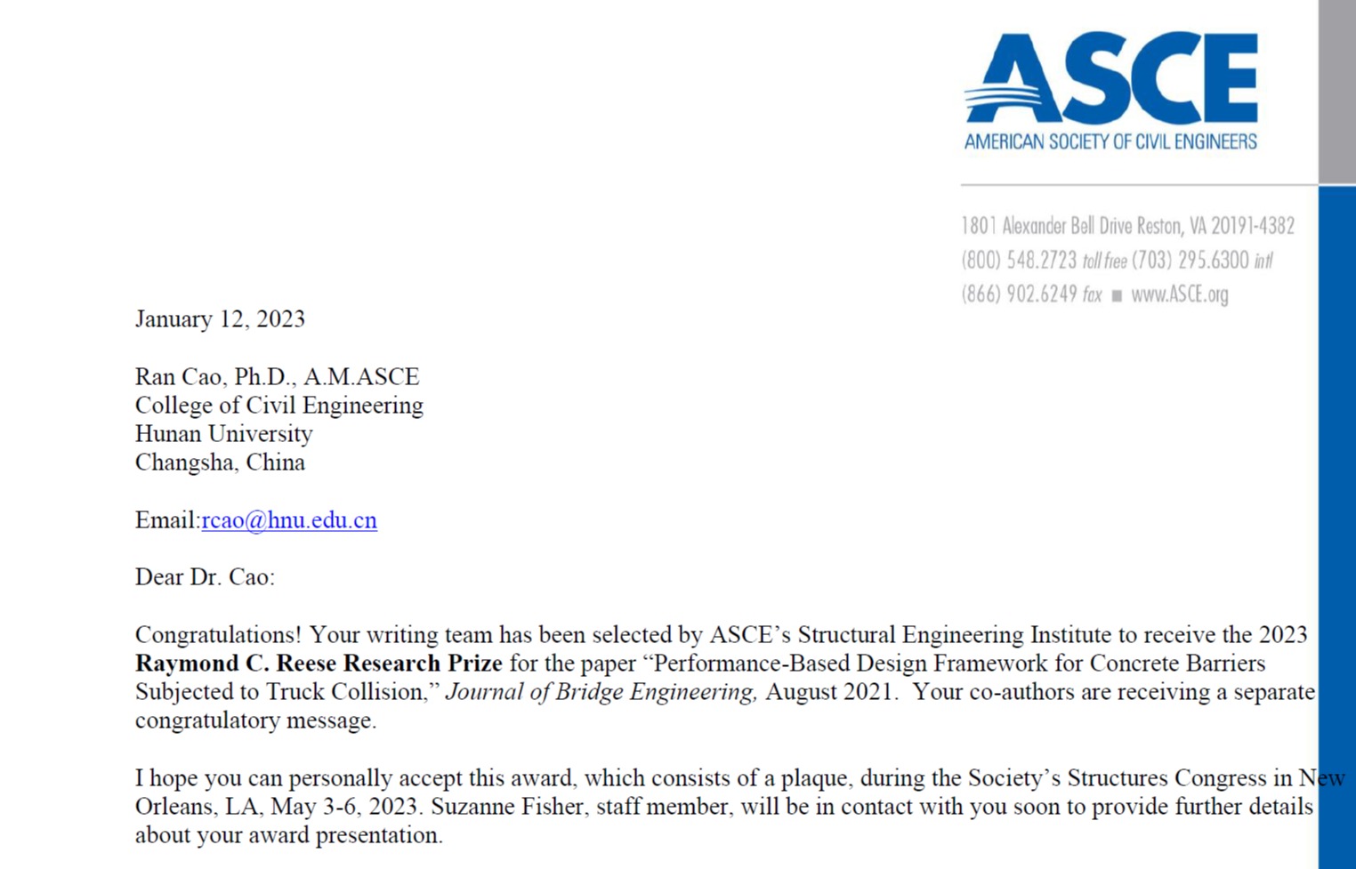近日,我校土木工程学院曹然副教授获美国土木工程师协会ASCE颁发的雷蒙德·里斯奖(Raymond C. Reese Research Prize),以表彰其发表在国际桥梁领域知名期刊ASCE《Journal of Bridge Engineering》的论文《Performance-Based Design Framework for Concrete Barriers Subjected to Truck Collision》在结构工程领域作出的贡献。获奖成果由湖南大学党委宣传部(新闻办公室)地址中心、美国纽约城市大学、美国密歇根大学合作完成,我校为第一作者单位,该论文原创...
