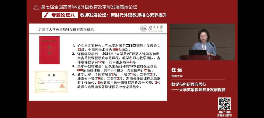 近日,第七届全国高等学校外语教育改革与发展高端论坛在北京举办。论坛主题为“大道致远,知行合一”。外国语学院院长莫再树教授,刘正光教授参加论坛,副院长任远副教授以“教学与科研同向同行——大学英语教师专业发展探微”为题在分论坛作专题发言。任远作专题发言。8场专题论坛,探讨构建高质量外语教育与人才培养体系实践路径,2场前沿论坛探讨外语类专业与大学外语课程体系创新路径与育人方略,为培育能够担当中华民族复...