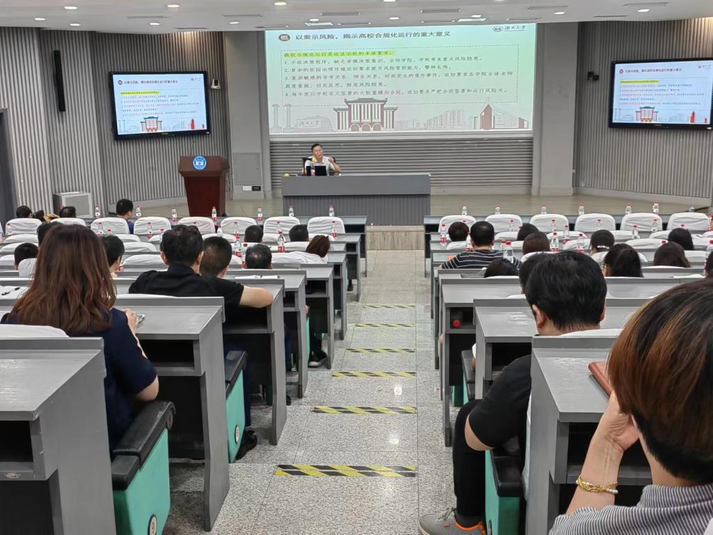 9月6日下午,法律事务办公室在复临舍报告厅组织开展专题培训会,各二级单位法治负责人、法治专干共90余人参加。本次培训由法律事务办公室主任高中教授及专职法律顾问、一级律师凌立志教授主讲。高中教授以“高校合规化运行的现实意义及具体举措”为题,凌立志教授以“合同管理的理念——兼谈风险的管控”为题作培训报告。培训会现场。来源:法律事务办通讯员:袁江平责任编辑:文亦