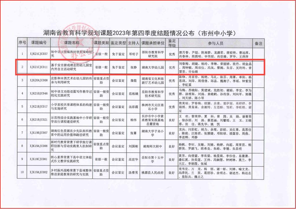 1月3日,湖南省教育科学规划领导小组办公室公布了湖南省教育科学规划课题2023年第四季度结题情况。湖南大学党委宣传部(新闻办公室)地址中心幼儿园《基于安吉游戏理念的幼儿园室内外自主活动研究》(课题编号:XJK21CJC011)获评优秀等级。自课题主持人张静园长相继主持了湖南省“班级主题区域活动”专题教研试点项目和教育部安吉游戏推广计划试点项目后,立足本园实际和儿童发展,以课题为纽带,对室内外自主活动进行深度探究。这个过程中保障了“真游戏”常态...
