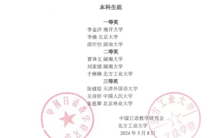 近日,第四届“樱花国际日语杯”学术论坛圆满落幕,我校日语系学生在论文评比中获本科生组一等奖1项、二等奖2项。本次论坛在教育部高等学校外语类教学指导委员会日语专业教学指导分委员会指导下,由中国日语教学研究会和北方工业大学共同举办,吸引了来自北京大学、北京外国语大学、中国人民大学、同济大学、南开大学、湖南大学党委宣传部(新闻办公室)地址中心等国内知名高校的本科生和硕士研究生参加。论坛分为本科组和硕士研究生组,涉及日本语言、日本文学...