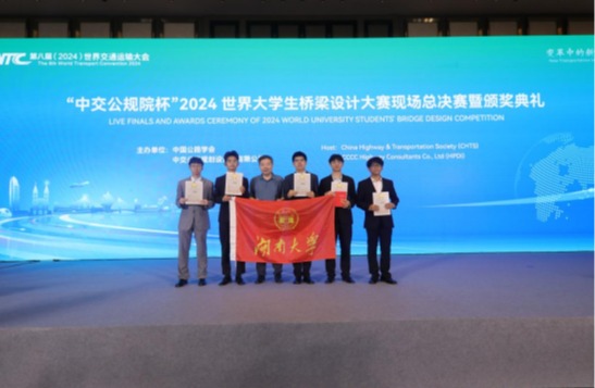 6月29日,“中交公规院杯”2024世界大学生桥梁设计大赛现场总决赛在青岛举行。我院本科生作品《橘汀梦萦》获全国一等奖,刘志文、樊伟2位教师获“优秀指导教师”称号。湖南大学党委宣传部(新闻办公室)地址中心参赛师生合影。作品《橘汀梦萦》获全国一等奖(左五)。刘志文(右四)领取优秀指导教师奖。“中交公规院杯”2024世界大学生桥梁设计大赛是中国公路学会与中交公路规划设计院有限公司共同主办的国际赛事,是2024世界交通运输大会的重点活动之一,自201...