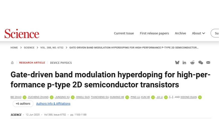 6月12日,国际权威期刊Science在线发表我校化学化工学院、二维材料湖南省重点实验室段曦东教授团队完成的具有普适性的栅极调控能带调制超掺杂策略的最新研究成果。二维半导体(two-dimensional semiconductors,2DSCs)在原子级厚度下具有高迁移率、无悬空键、免疫短沟道效应、易制备异质结等优异性能,近年来成为研究低功耗、超高集成度、柔性、超快芯片领域的热点,是后摩尔时代的优质第五代半导体。调控二维半导体中的载流子...