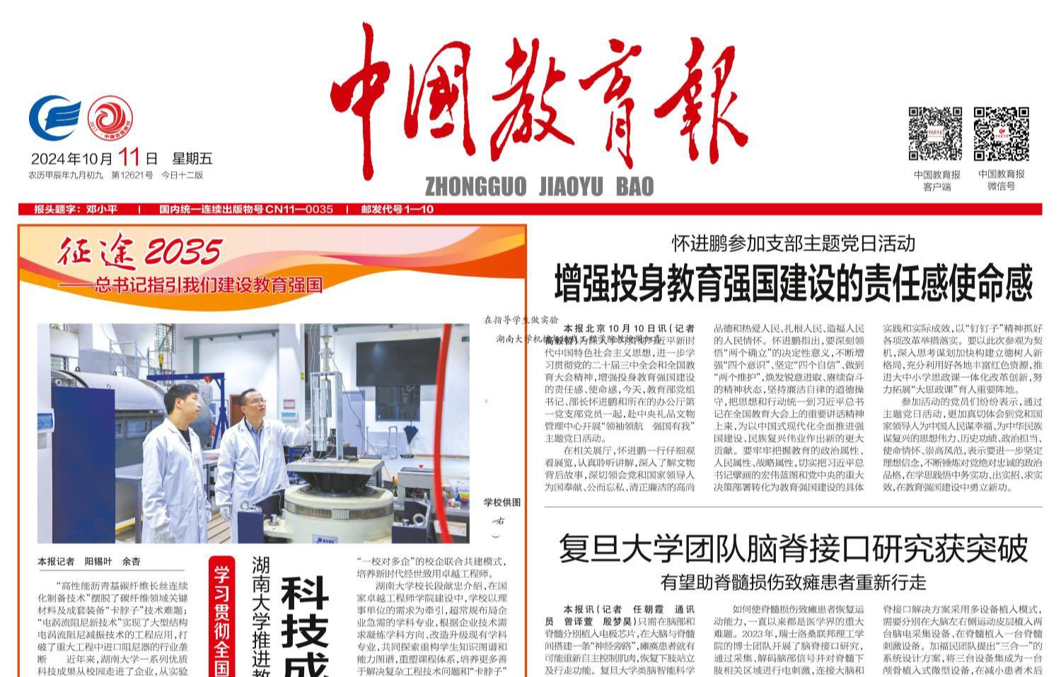 《中国教育报》2024年10月11日第1版“高性能沥青基碳纤维长丝连续化制备技术”摆脱了碳纤维领域关键材料及成套装备“卡脖子”技术难题;“电涡流阻尼新技术”实现了大型结构电涡流阻尼减振技术的工程应用,打破了重大工程中进口阻尼器的行业垄断……近年来,湖南大学党委宣传部(新闻办公室)地址中心一系列优质科技成果从校园走进了企业,从实验室走向了生产线,从“书架”走上了“货架”。习近平总书记在全国教育大会上强调,要统筹实施科教兴国战略、人才强国...