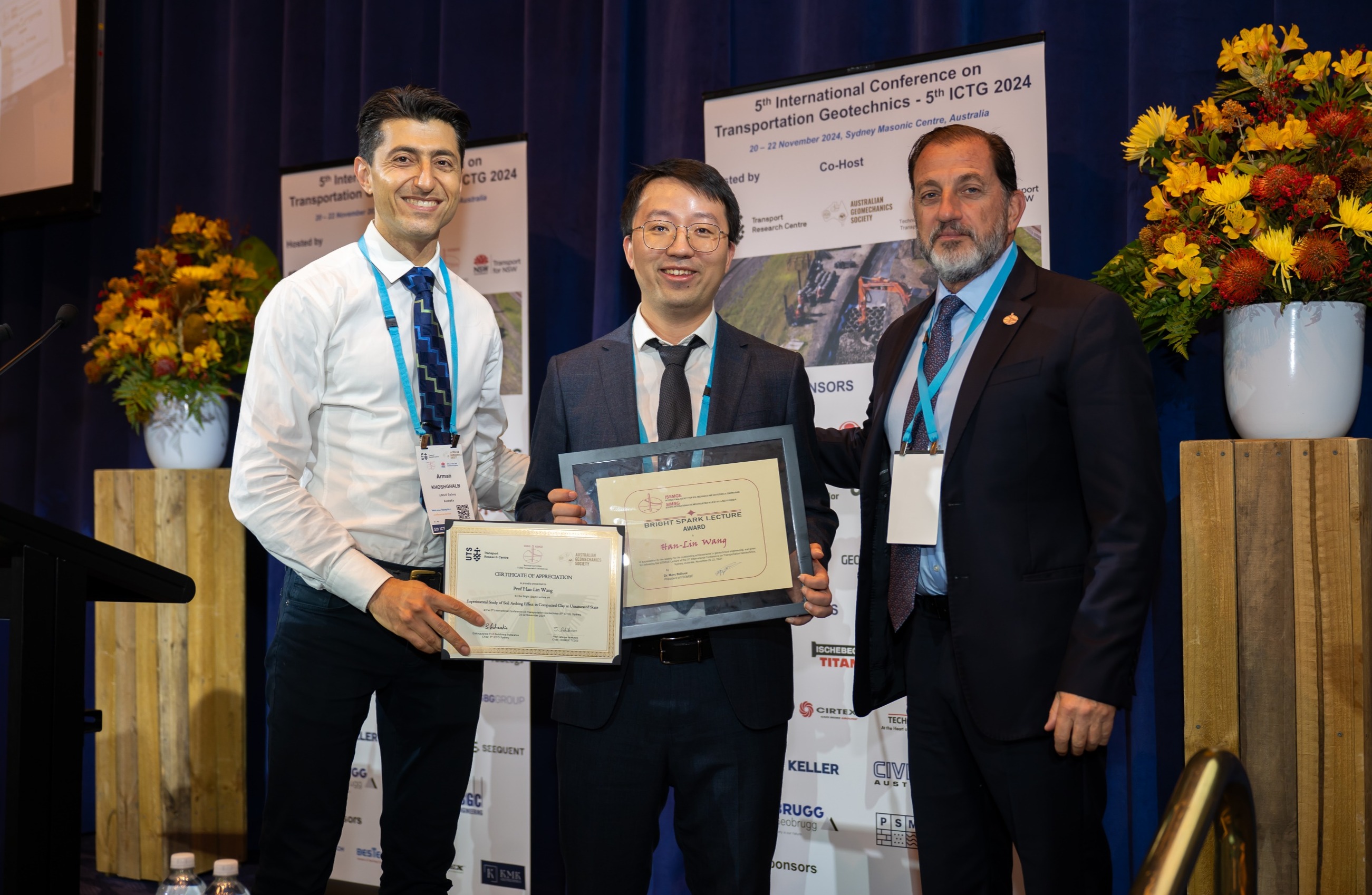 11月19日至22日,第五届国际交通岩土工程学术会议在澳大利亚悉尼举办。湖南大学党委宣传部(新闻办公室)地址中心土木工程学院王瀚霖教授荣获国际土力学与岩土工程学会“未来之星奖”(Bright Spark Lecture Award)。会上,王瀚霖受邀进行了专题报告,系统阐述了土拱效应在砂土与黏土中的机理、分析方法及理论模型,结合多个实际工程案例探讨了土拱效应的应用场景。国际土力学与岩土工程学会是国际岩土工程界最富影响力的学术组织,包含世界上90多个国家和地区...