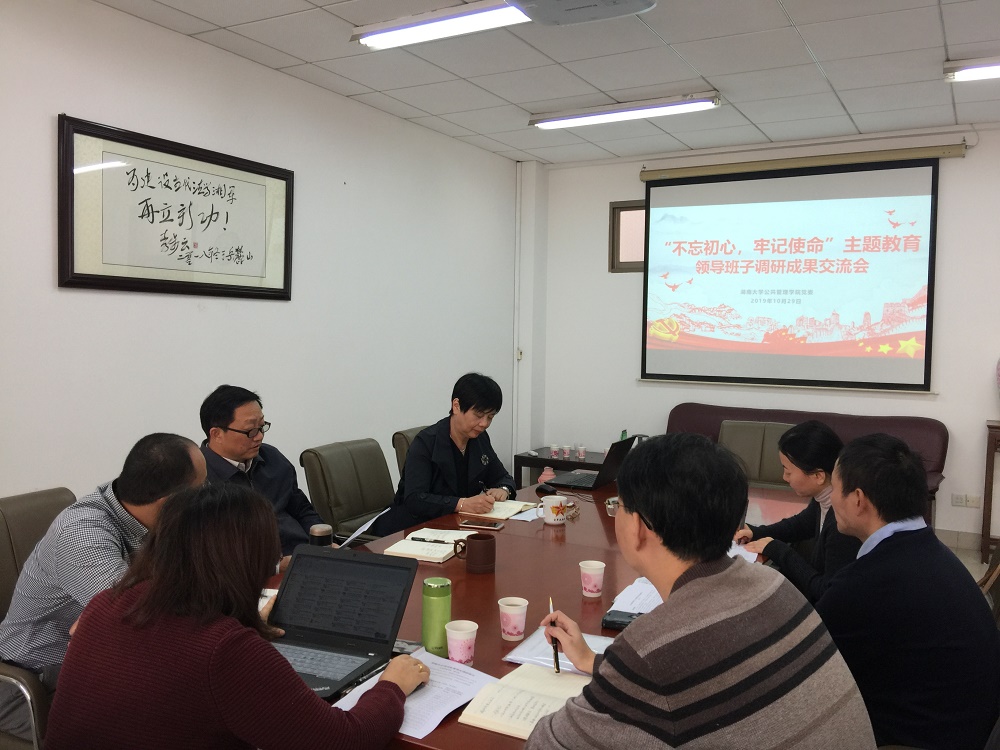 10月29日下午,公共管理学院党委召开“不忘初心、牢记使命”主题教育调研成果交流会,院领导班子成员对照主题教育总要求和目标任务,交流各自调研情况,分析调研中发现的问题,提出对策建议,进一步强化找差距、抓落实的责任担当。院党委书记付蓉芬主持会议并报告调研成果,院长李连友、副书记纪委书记杜倩博、副院长雷玉琼、谭海波分别发言,副院长徐莹(民主党派)列席会议。学校第三督导组党委教师工作部副部长鲁阿庆出席...