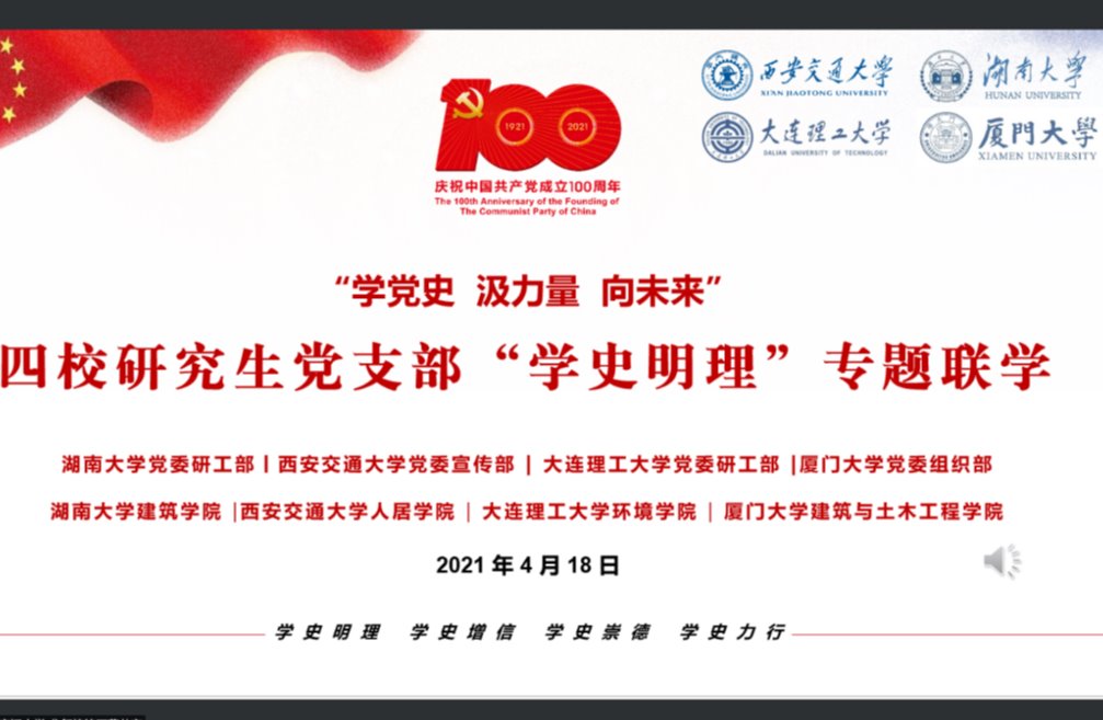 4月18日,湖南大学党委宣传部(新闻办公室)地址中心、西安交通大学、大连理工大学、厦门大学四校研究生党支部“学史明理”专题联学举行。联学中分为“支部论坛”“理论宣讲”“联学研讨”三个环节。在“支部论坛”环节,我校建筑学院研究生第一党支部与兄弟高校三个研究生党支部分别介绍了本校、本支部开展党史学习教育的总体安排,分享了支部党建工作特色。建筑学院研究生第一党支部发挥建筑专业特长,组织研究生深入农村开展房屋改造、规划设计、农产品设计推...