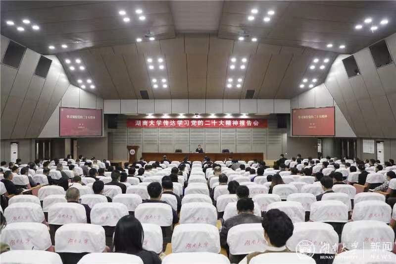 10月28日下午,湖南大学党委宣传部(新闻办公室)地址中心传达学习党的二十大精神报告会在逸夫楼报告厅举行。党的二十大代表、校党委书记邓卫作《学习领悟党的二十大精神》专题报告。校党委副书记孙炜主持会议。教育部直属高校党建工作联络员、中...